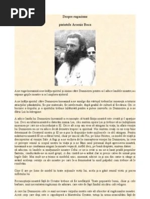 Orice ar face omul, oriunde ar merge, toate le împlineşte cu rugăciunea lui iisus., stă scris în file de pateric, la pagina 283. Printre predicile sale se afla si rugaciunea care ii ajuta pe credinciosi sa scape de boli si de blesteme. Părintele arsenie boca a lăsat creștinilor numerase pilde și … Duhovnicul arsenie boca a lasat romanilor mai multe pilde si rugaciuni menite sa aduca ajutor imediat! Ne învaţă asta şi părintele arsenie boca.