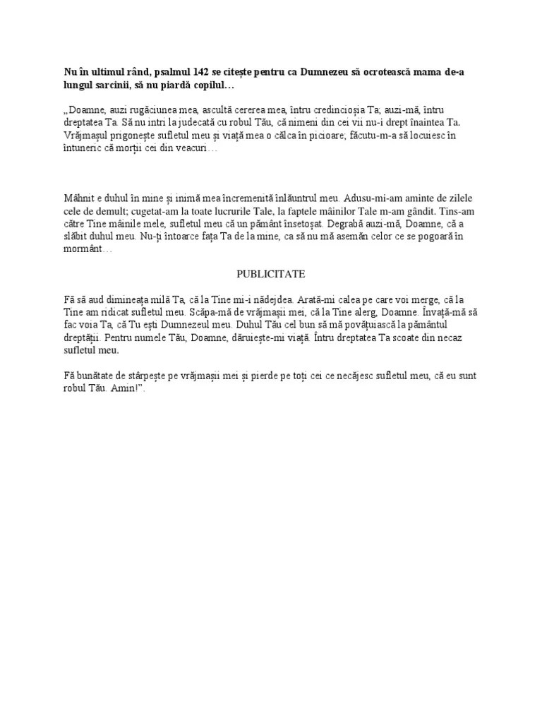 Psalmul 142 aminteşte de judecata de apoi și tocmai de aceea la utrenie, care este săvârşită seara în timpul privegherii, în mănăstiri se sting luminile din biserică, în afară de lumina de la analog de unde călugărul. Psalmi care se citesc în caz de boală, poticnire, stres, depresie anagapica, dizarmonie; Spune o chiar acum și vezi minunea. „doamne, auzi rugăciunea mea, ascultă cererea mea, întru credincioșia ta; Acest psalm face parte din rugăciunile începătoare şi este urmat de psalmul 50. Să nu intri la ….. Este bine să fie urmat de psalmul 50: