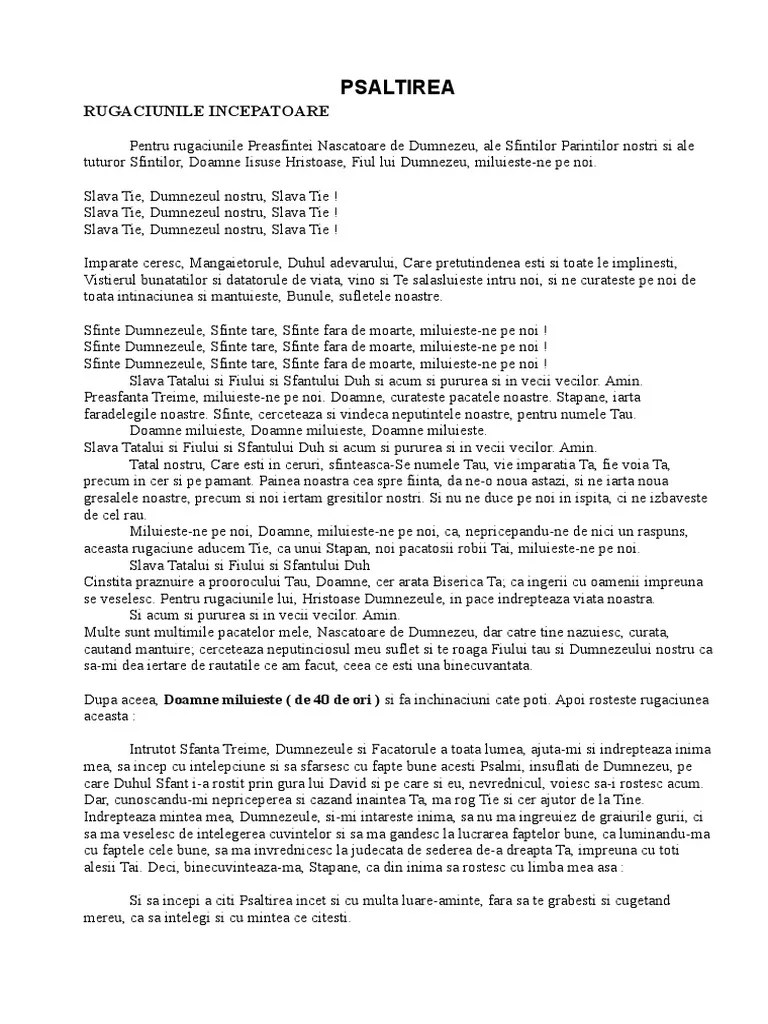 < citirea psaltirei catisma 1 >. Slava tie, dumnezeul nostru, slava tie ! Slava tie, dumnezeul nostru, slava tie ! Binecuvântat este dumnezeul nostru totdeauna, acum și pururea și în vecii vecilor. Î mpărate ceresc, mângâietorule, duhul adevărului, care pretutindenea ești și toate le împlinești, vistierul bunătăților și dătătorule de viață, vino și te sălășluiește întru noi, și ne curățește pe noi de toată întinăciunea și. De ești preot, începi așa:. Slava tie, dumnezeul nostru, slava tie !